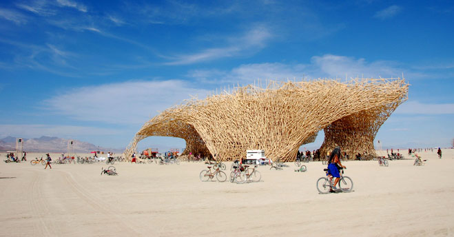 Fortunately, during the day’s long journey hot as hell to freezing night, the temperature passed through something more moderate, something that could sustain life. As a result, the late afternoon became my favorite time of day on the playa, when cool winds would appear from nowhere. The escape from heat felt like sudden freedom, and the ability to ride about and look around was sheer joy. During the late afternoons, it was still like being on another planet, but one where the atmosphere was temperate and hospitable, and the strange aliens were extremely friendly. These aliens bore gifts of snacks and martinis, but still, they were bizarre, outlandish, garish. Just standing there watching burners walk about felt like having ingested a mild hallucinogenic.
